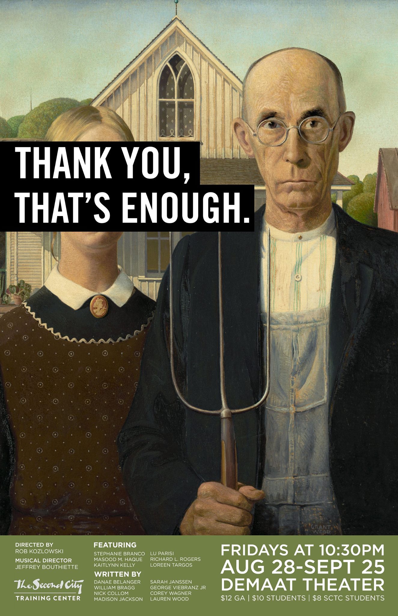 If you live in the Chicago area and like to laugh at how terrible human beings are in general, then come see “THANK YOU, THAT’S ENOUGH” at The Second City. Written by me and seven other weirdos. Performed by six actors who are sure to make you spit your drink out at least once.